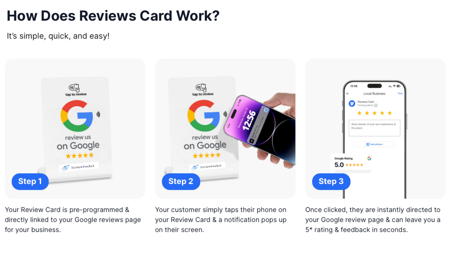 It’s simple! Customers just tap their phones on our ReviewRocket cards or table cards. They’ll be directed straight to your Google or Trustpilot reviews page, where they can leave a 5-star review instantly, boosting customer engagement and increasing your review count.